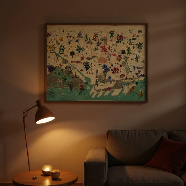 Obras de arte creadas mediante sublimación de telas (la tela se llama ciré). Cada pieza es intervenida a mano con `pintura, son seriadas, con un limite por diseño.