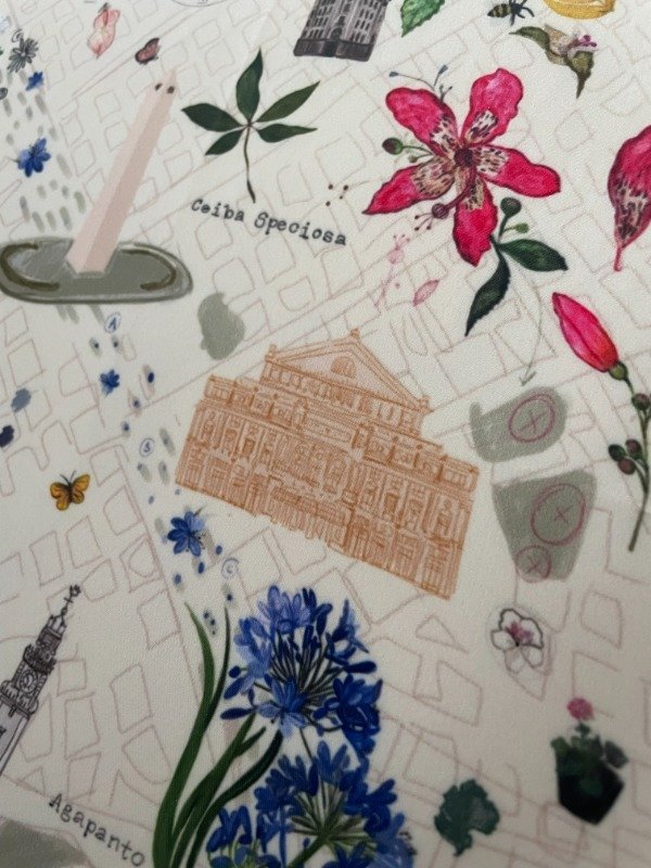Un estudio botánico de las flores de Buenos Aires: jazmín, Santa Rita, Lapacho y tantas más. Junto con sus edificios emblemáticos como el obelisco, el Teatro Colón , el Congreso o la Confitería el Molino entre otros.